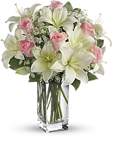 Stunning in its simplicity, this innocent harmony of light pink roses and snow white lilies are a heartfelt way to send your very best. The classic, clear rectangular glass vase keeps the focus on the heavenly beauty of the blooms.